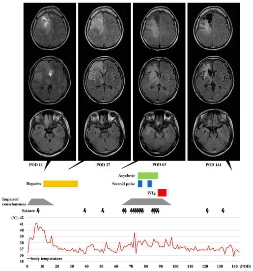 - Berger, A.; Shahar, T.; Margalit, N. Herpes Simplex Type 2 Encephalitis After Craniotomy: Case Report and Literature Review. World Neurosurg. 2016, 88, 691.e9–e12. [Google Scholar] [CrossRef] [PubMed]