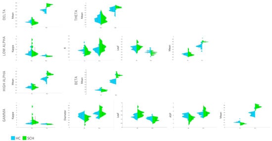 Overall, in the case of 23 variables, the between-group difference reached the threshold of p < 0.05. Figure 1 presents distribution plots of all statistically significant results that survived FDR correction for repeated testing. Among these variables, 15 were based on the PLV and 8 were based on the PLI. Considering the effect size variable, the “Mean” differentiated the groups to the greatest extent. The largest intergroup differences concerned the following variables: the PLV-based mean MST in the delta frequency (d = 4.69), the PLV-based mean in gamma frequency (d = 4.13), the PLV-based mean in the beta frequency (d = 3.33), the PLV-based mean in the low-alpha frequency (d = 2.83), the PLV-based mean in the high-alpha frequency (d = 2.78), and the PLI-based mean in gamma frequency (d = 2.35). It is worth noting that in some pairs of MST results the values based on the PLV were significantly higher in SCH patients than in controls, while the same MST variables based on the PLI in the same frequency presented the opposite difference, i.e., values were lower in SCH patients than in controls. For example, in the gamma band, the mean MST values based on the PLI in groups (SCH vs. HC) were 0.144 vs. 0.221, while the values for the PLV-based measure were 0.842 vs. 0.553. Besides the MST mean, the other network metrics that differentiated the groups the most (with d > 1) were the PLI-based ASP (d = 1.28), the PLI-based diameter (d = 1.20), and the PLI-based leaf (1.19)—all in the gamma band—and the PLV-based kappa in the low-alpha band (d = 1.11). As in the case of the MST mean, for some of these variables the opposite directions of difference in measures could also be observed based on the PLI and PLV indicators (e.g., the ASP in the gamma band).