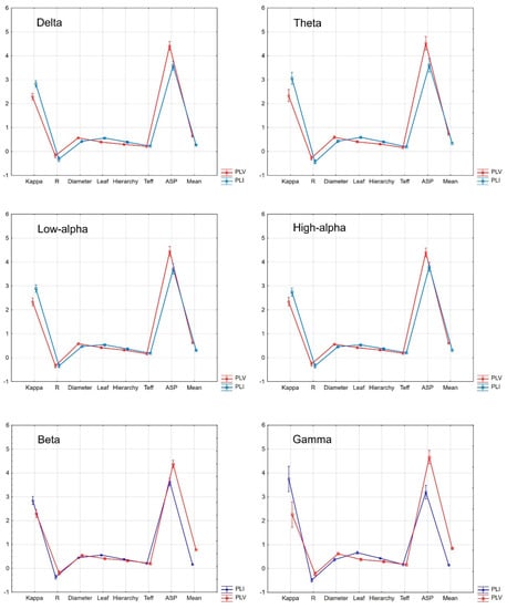 Despite some advances in assessing FC measures in terms of their validity and reproducibility, according to our knowledge, the recognition of how different FC indexes may affect the scope and direction of differences between schizophrenia patients and healthy controls regarding the parameters of the global neuronal network configuration described in the language of graph theory had not yet been carried out. The answer to this question seems important, taking into account the significant range of study outcomes regarding the specificity of the organization of neural networks in schizophrenia and the observed heterogeneity of results in this area []. This heterogeneity was even observed within a set of studies using the same computational solutions to obtain global neural network arrangement typology, such as a minimum spanning tree []. In an extensive review that aimed to find a repeatable constellation of graph-theory network reconstructions based on MST, the authors indicated that, regarding the adult psychiatric population, especially those suffering from schizophrenia, the results are indisputably conflicting. However, the problem of using FC input gained from different connectivity computations was not considered as a possible important source of inconsistency []. To verify if two different types of FC indicators might generate different or even contradictory results for the extent that the global neural networks of schizophrenia patients differ from healthy controls, we conducted two identical computational analyses, one with the PLI as a synchronization measure and another with the PLV.