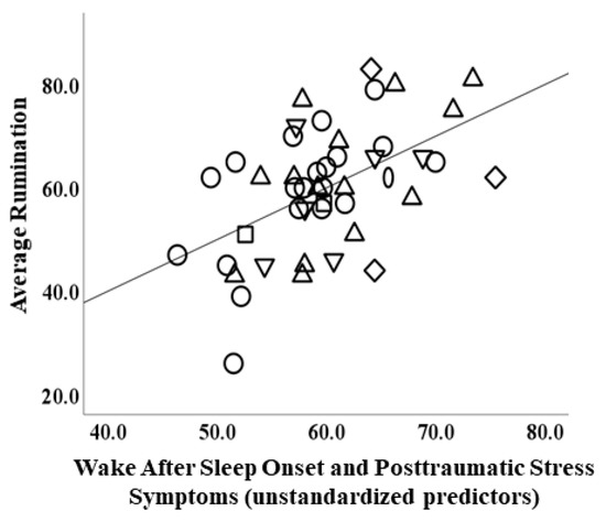 Scatterplot depicting relationship between actigraphic wake after sleep onset and posttraumatic stress symptoms (PTSD Checklist-Civilian Version) (unstandardized predictors) and rumination (ruminative response scale). Note: circle = principal generalized anxiety disorder; upright triangle = principal major depressive disorder; oval = principal panic disorder; square = principal persistent depressive disorder; diamond = principal posttraumatic stress disorder; downward triangle = principal social anxiety disorder.