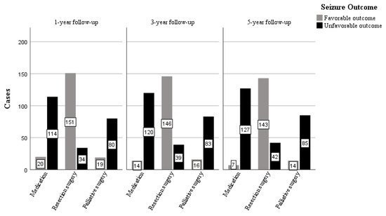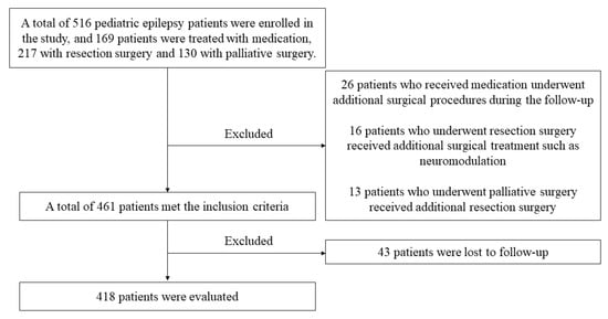 Psychological assessments at the 1st, 3rd, and 5th year follow-ups were performed to evaluate the cognitive or behavioral problems. In children with non-resective surgery, the palliative or medication groups, clinical characteristics, and prognosis were compared. Continuous variables were described as means and standard deviations, and categorical variables as frequencies and percentages. To identify potential predictors of seizure outcomes in patients treated by surgery, a univariate analysis was carried out, where categorical variables were analyzed with the chi-squared or Fisher’s exact test. Continuous variables were compared with the Mann–Whitney U test. Variables with a p < 0.2 in the univariate analysis were entered into a multivariate logistic regression model by backward elimination. Statistical significance was considered at p < 0.05. Analysis was performed using SPSS version 25.0 software (SPSS Inc., Chicago, IL, USA).