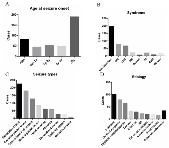 (A–D) summarized the clinical characteristics of pediatric patients with drug-resistant epilepsy in terms of age at seizure onset, epileptic syndrome, seizure type, and etiology, respectively.