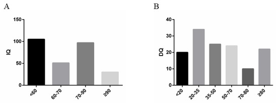 (A). IQ of children over 6 years old at enrollment. (B). DQ of children under 6 years of age at enrollment.