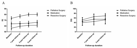 During the follow-up, the intellectual and psychological development of most patients showed varying degrees of improvement (Figure 4). The most favorable outcomes for both seizures and cognitive function were in the resection group, the palliative surgery, and the medication groups respectively (Figure 5), similar to previous reports [53,54]. A study conducted by Veersema et al. [55] showed that 2 years post epilepsy surgery 24 of 36 patients had a ≥10 points increase in IQ. These were similar to our study, where patients who had resective epilepsy surgery had an IQ increase of ≥10 points (25.95%) in the resection group. Similar results were recorded in 16.16% and 6.72% of the palliative surgery group and medication group, respectively. Cumulatively, the side effects of long-term AED use diminish efficacy and lead to mental retardation [56,57]. In the present study, 43 and 7 patients in the resection and palliative surgery groups, respectively, were successfully weaned off AEDs. In a systematic review of epilepsy in children, a strong relationship was found between intelligence quotient decline and continued seizures [58]. Moreover, a cohort study of children <3 years old who underwent epilepsy surgery found that early surgery was associated with increased postoperative DQ [59]. As a consequence, evidence shows that improvement in cognitive function was closely linked to better seizure outcomes.