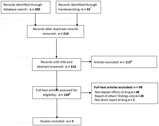 In total, the electronic database searches yielded 205 records (PubMed 15; Embase 110; and PsycInfo 80), of which 32 were retrieved from handsearching, including 7 results from a search of clinicaltrials.gov (of which none were relevant; see Figure 1). After removing duplicate records, 216 articles remained and were subject to screening. Screening led to the exclusion of 113 articles, leaving 103 whose full texts were reviewed. The majority of the articles were excluded at this stage, leaving five which met our eligibility criteria.
