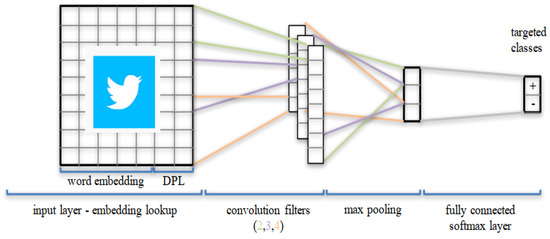Convolutional Neural Network (CNN), which was initially developed in the Neural Network Image Processing Community (NNIPC), is a famous kind of Feed-forward Neural Network (FNN) with a profound structure and has shown outstanding simulation results in various tasks, particularly in NLP tasks, such as sentence analysis of various languages in different applications. Multiple types of CNN, including the typical model, have been an important focus of research as they can be applied to complex problems involving time-varying patterns [49,50,51]. The standard CNN involves two operations, which feature extractors, convolution and pooling; the obtained output is then associated with the following [23]. CNN can interpret spatial data through the convolution layers (CL). A CL has various filters or kernels, which it learns to extract specific features from the corresponding dataset. The kernel is a 2D window that has sided over the convolution operation’s input data. We use temporal convolution in our experiments to analyze sequential data like tweets. The typical CNN architecture is used to simulate the Arabic tweets datasets of STC, Zain, and Mobily for classification purposes, as given in the following Figure 2.