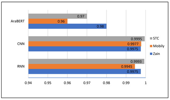 Table 2 shows training error results measured during the training experiments on the RNN, CNN, and AraBERT models. The CNN model has the lowest training error for all the training data sets, i.e., Zain, Mobily, and STC. While AraBERT has the highest training errors for these data sets. The AraBERT is not converging in training experiments due to its more comprehensive scope of classifying emojis and Arabic text; thus, it has significant training errors. This property makes it capable of generalizing for testing/validation data sets. In this way, it avoids overfitting.