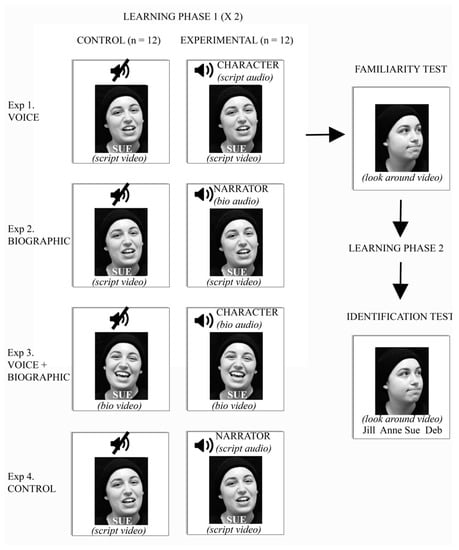 In the Voice experiment, script-reading audiovisual clips were used for both the control (face/name) and the experimental multi-modal conditions, but without sound in the control condition. Thus, in the multi-modal condition of this experiment, face-learning was accompanied by the voice of the character, but the voice did not impart any biographic information.