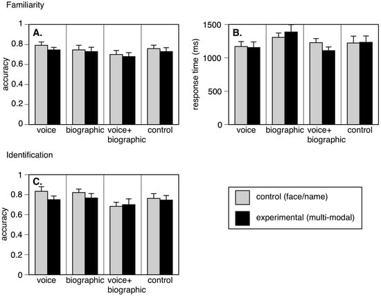 On each of the three outcome variables, we conducted a 2 × 4 mixed factor ANOVA with condition (control face/name, multi-modal) as a within-subjects factor and experiment (voice, biographic, voice-biographic, and control) as a between-subjects factor, separately for familiarity and identification results. We also performed planned a priori pair-wise comparisons between multi-modal and control conditions of each experiment, using 2-tailed paired-sample student’s t-tests with Bonferroni correction for multiple comparisons (critical p = 0.0125).