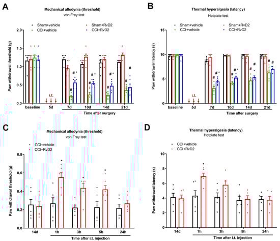 Intrathecal treatment with RvD2 reduces the production and persistence of neuropathic pain caused by peripheral nerves injuries. (A,B) Intrathecal RvD2 (500 ng) was given daily on days 4, 5 and 6 (indicated by red arrows) following sham and CCI operations. (C,D) RvD2 (i.t., 500 ng) was given on day 14 following CCI surgeries. Mechanical allodynia was evaluated by paw withdrawal threshold (A,B) using von Frey experiments, and thermal hyperalgesia was evaluated by paw withdrawal latency (B,D) using hotplate experiments. Behavioral results are expressed as the mean ± SEM (n = 6) and compared using two-way ANOVA followed by Bonferroni multiple comparisons. # p < 0.05 vs. group sham + vehicle. * p < 0.05 vs. group CCI + vehicle. i.t. = intrathecal injection.