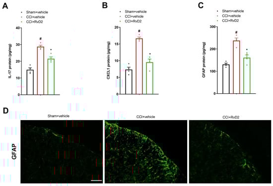 Astrocyte-mediated neuroinflammatory responses in the dorsal horn are of great significance in the pathogenesis of long-lasting pain [,]. We employed an ELISA assay to measure the spinal IL-17, CXCL1 and GFAP concentrations. All of the assays reliably produced the expected standard curves of the IL-17, CXCL1 and GFAP concentrations (Supplementary Materials, Figure S1A–C), suggesting reliable measurements within the specified concentration range. We observed an obvious elevation in the spinal expressions of IL-17, CXCL1 and GFAP in the animals 7 days after peripheral nerve trauma using an ELISA assay (p < 0.05, n = 4; Figure 2A–C). Furthermore, these inflammatory mediators were measured to verify whether they were implicated in RvD2 anti-nociception in the CCI animals. Interestingly, repetitive pre-administration of RvD2 (i.t., 500 ng) suppressed the rise in IL-17, CXCL1 as well as GFAP expression in the dorsal horn following CCI surgeries (p < 0.05, n = 4; Figure 2A–C). Additionally, we detected the reduction in CCI-induced spinal activation of the astrocytes by RvD2 pretreatment using immunohistochemistry experiments (Figure 2D). Taken together, these biochemical findings suggest that RvD2 prevents long-lasting neuropathic pain through spinal inhibition of neuroinflammation.