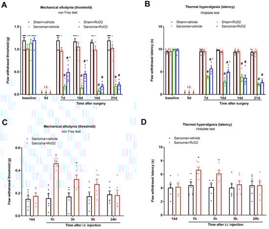 Next, to evaluate the therapeutic potential of RvD2 in bone cancer pain, repeated injections of RvD2 (i.t., 500 ng) were performed on days 4, 5 and 6 (in the early phase) following the injection of NCTC sarcoma cells into the distal femur condyle. Herein, both the von Frey test and hotplate test detected that sarcoma implantation caused a long-lasting decrease in the mechanical PWT and thermal PWL, suggesting the successful establishment of chronic bone cancer pain (p < 0.05; Figure 3A,B). Strikingly, repetitive pretreatment with RvD2 reduced the generation of sarcoma-induced mechanical allodynia and heat hyperalgesia, as indicated by the robust rise in the mechanical PWT (F (3, 100) = 181.6, p < 0.0001, n = 6, two-way ANOVA; Figure 3A) and the considerable extension in the heat PWL (F (1, 100) = 471.7, p < 0.0001, n = 6, two-way ANOVA; Figure 3B).