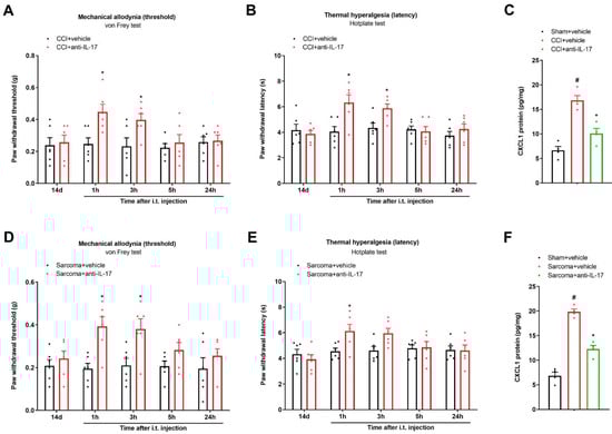 Spinal neutralization of IL-17 reduced chronic neuropathic pain and bone cancer pain. A neutralizing antibody against IL-17 (anti-IL-17) was intrathecally injected (2 μg) on day 14 after peripheral nerve injuries and sarcoma cell implantations, respectively. Mechanical allodynia (A) and thermal hyperalgesia (B) after CCI surgeries and anti-IL-17 injections were documented using von Frey experiments and hotplate experiments, respectively. (C) ELISA assay showed that anti-IL-17 administration reversed the elevated expressions of spinal CXCL1 proteins in CCI animals. # p < 0.05 vs. group sham + vehicle. * p < 0.05 vs. group CCI + vehicle. (D,E) Intrathecal injection of anti-IL-17 impaired the established bone cancer pain in sarcoma-treated mice. (F) ELISA assay showed that anti-IL-17 administration reversed the elevated expressions of spinal CXCL1 proteins in sarcoma animals. # p < 0.05 vs. group sham + vehicle. * p < 0.05 vs. group sarcoma + vehicle. Results from behavioral experiments are presented as the mean ± SEM (n = 6) and compared using two-way ANOVA followed by Bonferroni multiple comparisons. Results from biochemical experiments are presented as the mean ± SEM (n = 4) and compared using one-way ANOVA followed by Bonferroni multiple comparisons. i.t. = intrathecal injection.