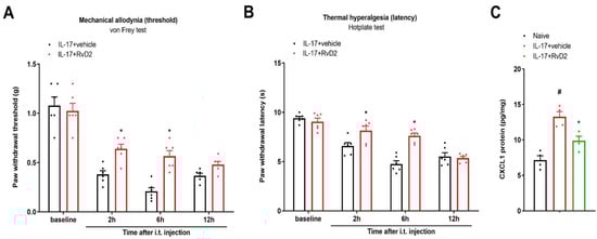 Generation of acute pain by IL-17 exposure was reduced after co-administration of RvD2. RvD2 (i.t., 500 ng) was administered 1 h prior to recombinant IL-17 application (i.t., 400 ng). Mechanical allodynia was evaluated by measuring paw withdrawal threshold (A) using von Frey experiments, and thermal hyperalgesia was evaluated by measuring paw withdrawal latency (B) using hotplate experiments. Exogenous IL-17-induced acute pain behaviors were ameliorated by co-application of RvD2. (C) ELISA assay showed that RvD2 administration inhibited the elevated expressions of spinal CXCL1 proteins in IL-17-treated animals. Behavioral results are presented as the mean ± SEM (n = 6) and compared using two-way ANOVA followed by Bonferroni multiple comparisons. Results from biochemical experiments are presented as the mean ± SEM (n = 4) and compared using one-way ANOVA followed by Bonferroni multiple comparisons. # p < 0.05 vs. group naïve. * p < 0.05 vs. group IL-17 + vehicle. i.t. = intrathecal injection.