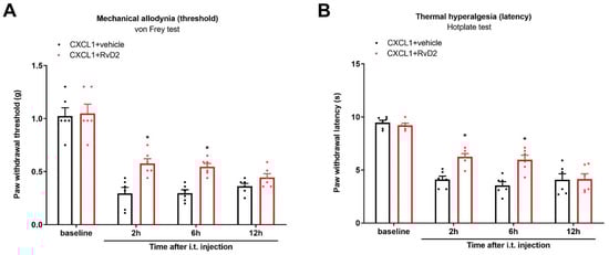 Generation of acute pain by CXCL1 exposure was reduced after co-administration of RvD2. RvD2 (i.t., 500 ng) was administered 1 h prior to recombinant CXCL1 application (i.t., 100 ng). Mechanical allodynia was evaluated by measuring paw withdrawal threshold (A) using von Frey experiments, and thermal hyperalgesia was evaluated by measuring paw withdrawal latency (B) using hotplate experiments. Exogenous CXCL1-caused acute nociceptive phenotypes were ameliorated by co-application of RvD2. Results are presented as the mean ± SEM (n = 6) and compared using two-way ANOVA followed by Bonferroni multiple comparisons. * p < 0.05 vs. group CXCL1 + vehicle. i.t. = intrathecal injection.