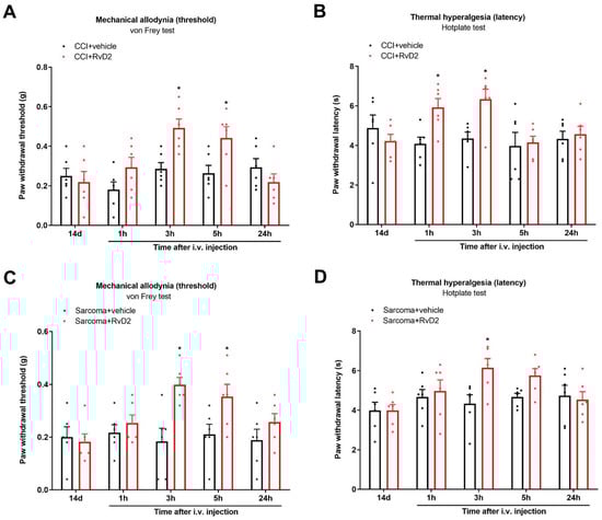 Systemic therapy of RvD2 reduced the existing chronic neuropathic pain and bone cancer pain. RvD2 (5 μg) was intravenously (i.v.) given on day 14 following peripheral nerve trauma and sarcoma cell implantation, respectively. Mechanical allodynia was evaluated by measuring paw withdrawal threshold (A) using von Frey experiments, and thermal hyperalgesia was evaluated by measuring paw withdrawal latency (B) using hotplate experiments following CCI surgeries and RvD2 administrations. * p < 0.05 vs. group CCI + vehicle. (C,D) RvD2 post-treatment attenuated the established persistent bone cancer pain. * p < 0.05 vs. group sarcoma + vehicle. Results from behavioral experiments are presented as the mean ± SEM (n = 6) and compared using two-way ANOVA followed by Bonferroni multiple comparisons.