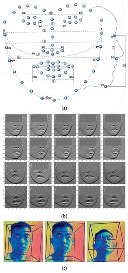 - 3D facial features: Openface2.0 is an open-source facial behavior analysis tool, which can implement facial landmark detection, head pose estimation, facial action unit recognition and eye-gaze estimation. It has been widely used in computer vision, affective computing and human–computer interaction []. In this study, Openface2.0 was used to extract 3D facial features from evaluation videos, including facial contour, eye-gaze [] and head-pose []. The facial features of subjects were chosen, including 3D facial landmarks of the head, to analyze the facial phenotype of subjects. Figure 2a shows the 68 facial landmarks, which represent facial contour, eye shape, nose and mouth. Each landmark was represented by an L(x, y, z) to indicate its position in 3D space. Subjects of different ages and genders possessed different scales of faces, which is not conducive to compare different faces directly. Therefore, the tool scaled the subject’s face in 3D space, and the scaling ratio is represented by p_scale; finally, the facial phenotypes of the subjects were compared at same scale. Figure 2b shows the subjects’ 2D faces images detected from videos, and Figure 2c shows the 3D facial landmarks extracted from the 2D face images. Combining the temporal information of neighbor frames, head-pose landmarks were extracted frame by frame from the videos. Neighbor frames contain subjects’ action information, which helps to extract these landmarks more accurately. The head-pose features included three different features (p_rx, p_ry, p_rz), which measures the 3D rotation degree between the head and the IP camera. In order to boost the reliability of our algorithm, we filtered the data according to the condition of confidence ≥0.98 (how confident is the tracker in current landmark detection estimate), |p_rx| ≤ 0.5, |p_ry| ≤ 0.25 and |p_rz| ≤ 0.5. Only those data meeting the above conditions, i.e., 22,602 data frames, were chosen for constructing the algorithm.
