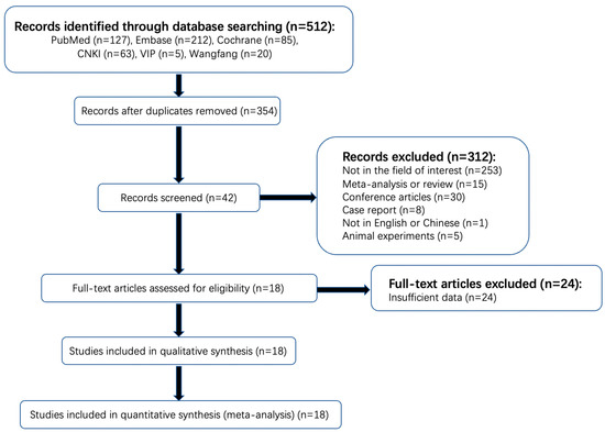 The detailed literature selection process is shown in Figure 1. A total of 512 articles were found in a systematic search. One hundred and fifty-eight duplicated articles were excluded on Endnote software, version 20.1 (Thomson Reuters, Philadelphia, PA, USA). Among the remaining 354 publications, 253 items were not in the area of interest and therefore excluded after reading the titles and abstract (the studies of patients with AIS were not included or did not complete CTP within the time limit or the outcome index of observation did not include HT). Thirty conference abstracts, fifteen reviews, eight case reports, five animal experiments, and one study of non-Chinese or -English literature were also excluded. Then, a full-text review of the remaining 42 potentially qualified articles was conducted. Twenty-four articles that did not provide the original data of CTP parameters of a normal distribution or the diagnostic performance of rPS, rCBF, or rCBV were further excluded. Finally, 18 articles were included, with a total sample size of 1423 cases, of which 13 articles provided the original data of CTP parameters that followed a normal distribution, with a sample size of 831 cases. A total of 11 articles provided sufficient information for the determination of the diagnostic performance of rPS, rCBF, or rCBV, with a sample size of 906 patients. No unpublished literature was included.