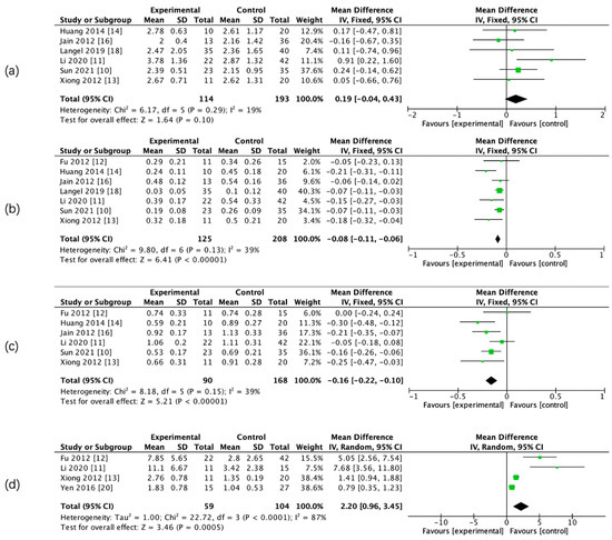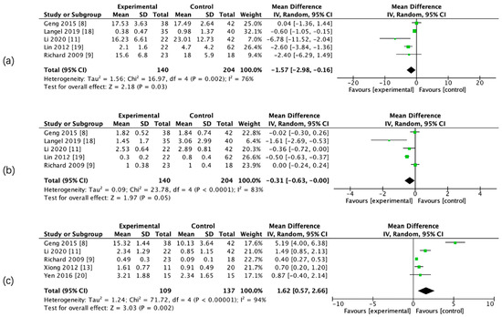 The meta-analysis of the included studies that provided original CTP parameters was carried out with RevMan software, version 5.4 (Cochrane Collaboration, Oxford, UK). An odds ratio (OR) was used between counting data, while mean difference (MD) was used for combined analysis between measurement data. The 95% CI was used to represent the combined effect. An I2 test was performed to determine whether there was any heterogeneity among the studies. The homogeneity among studies was defined as p > 0.1, I2 < 50%, where the fixed effect model was used for meta-analysis. Accordingly, heterogeneity was defined as p < 0.1, I2 > 50%, where the random effect model was used. Forest plots were drawn using RevMan software, which has been commonly used in meta-analyses. A forest plot summarizes the information of pooled studies, visualizes the heterogeneity, and shows the estimated common effect, I2.