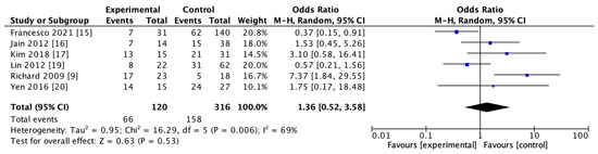 The use of rt-PA for reperfusion therapy at admission was reported in 6 studies including 436 subjects in both HT and non-HT groups. The results of the heterogeneity study suggested that there was heterogeneity among the studies (I2 = 69%, p = 0.006). The results of the meta-analysis using the random effect model showed that there was no significant difference in the use of rt-PA between the two groups (OR = 1.36; 95% CI, 0.52–3.58–0.53). The details are shown in Figure 5.