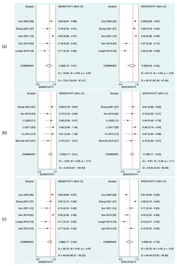 Figure 7. Pooled sensitivity and specificity of CTP parameters for diagnosis of HT. rCBF (a), rPS (b), and rCBV (c).