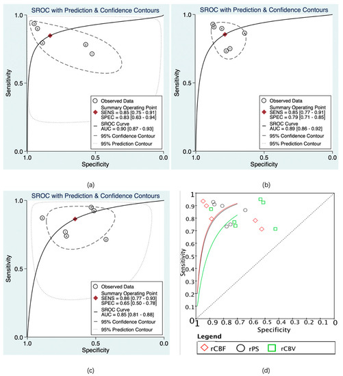 Figure 8. Summary receiver operating characteristic (SROC) of CTP parameters for diagnosis of HT. rCBF (a), rPS (b), rCBV (c), and SROC of rCBF, rPS, and rCBV (d). The numbers in the circles denote the data from different studies.