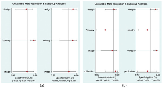 Only the models for country and reference standard resulted in covariates remaining significant. Whether the study was performed in China had an impact on the sensitivity of rCBF (p < 0.05) and the sensitivity of rCBV (p < 0.01) to predict HT. Whether the NCCT was the only follow-up image was related to the specificity of rCBV in the diagnosis of HT (p < 0.01). No covariates were found for the subgroup analysis (Figure 9).