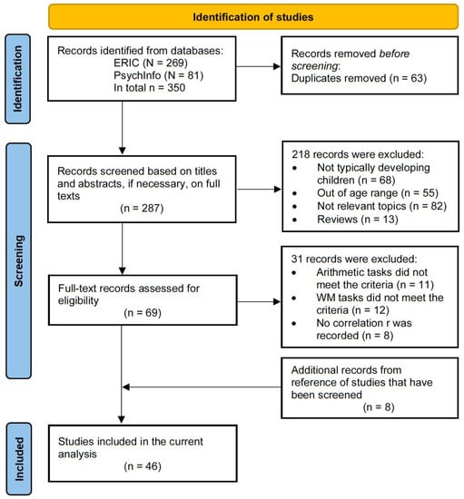 The search was conducted with combinations of the following terms: “working memory” AND (“arithmetic” OR “calculation” OR “computation”). This search was run over a period of weeks, with the last wave of new articles identified on 30 July 2022. The initial search yielded 269 results from ERIC and 81 results from PsychInfo. After removing duplicates (n = 63), 287 studies were screened in two stages. At stage 1, titles and abstracts were reviewed and studies that were obviously out of scope using four inclusion criteria were removed from further analysis: (1) The language of publication was English; (2) Participants included typically developing populations only: (3) Participants were elementary school children (aged 6 to 12); (4) The research was related but not limited to cognitive development and math learning; and, (5) The paper was an empirical study (i.e., not a review, meta-analysis or systematic review). This initial screening excluded 218 studies, 68 on atypically developing populations, 55 with participants outside the age range, 82 on irrelevant topics, and 13 reviews. This resulted in 69 remaining studies (see Supplementary File S2).