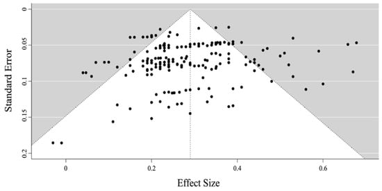 The funnel plot (see Figure 2) showed a near symmetry in the 187 effect sizes. The Egger test indicated no significant bias (p = 0.074), suggesting that there was little influence of publication bias in the current meta-analysis.