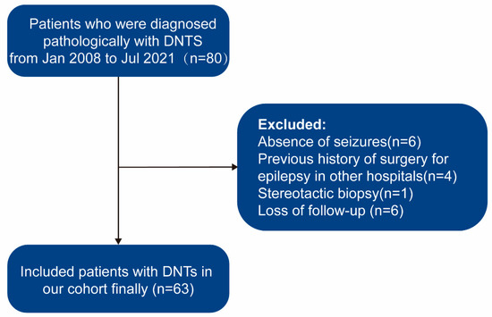 Flowchart describing the procedures and exclusion and inclusion criteria of this study. DNTs, dysembryoplastic neuroepithelial tumors.