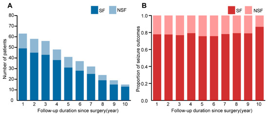 (A): Number of patients by seizure outcomes according to follow-up duration since surgery; (B): year-to-year analysis of seizure outcomes, the seizure-free rate remained basically stable.