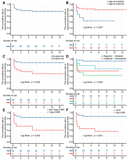 Kaplan–Meier analysis showed that the cumulative rate of seizure recurrence-free was 82.5% (95% confidence interval (CI) 73.7–92.5%), 79.0% (95% CI 69.5–89.9%), and 76.5% (95% CI 66.2–88.3%) at 2, 5, and 10 years, respectively (Table A1). The mean time for seizure recurrence-free was 6.892 ± 0.501 years (95% CI 5.91–7.87). The probability fluctuated in the first few years after surgery and gradually stabilized in subsequent years (Figure 4A).