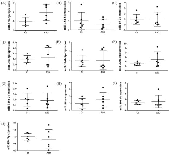 Expression of ten miRNA in the discovery cohort. The y-axis represents the ratio of relative expression values of the control and ASD subjects. The expression of ten miRNAs were measured by qPCR: (A) miR-15b-5p, (B) miR-15a-5p, (C) miR-19b-3p, (D) miR-27a-3p, (E) miR-160b-5p, (F) miR-320a-5p, (G) miR-320a-3p, (H) miR-451a, (I) miR-494-5p, and (J) miR-494-3p. miR, microRNA; Ct, controls; ASD, autism spectrum disorder.