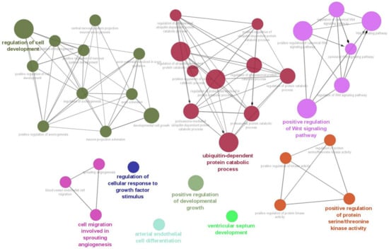 miRDB (http://mirdb.org/, accessed on 15 December 2022) was used for target gene prediction, and a target score of 90 or more was set as a reliable score. Subsequently, predicted target genes were subjected to the ClueGO plugin in the Cytoscape program [] to perform functional annotation of biological processes (BPs). Statistical significance was set at p < 0.05 with the post hoc Benjamini–Hochberg method. Based on significant BP terms, the graphical network was generated according to the following criteria: visual style = groups; GO term/pathway network connectivity = medium (kappa score = 0.40).