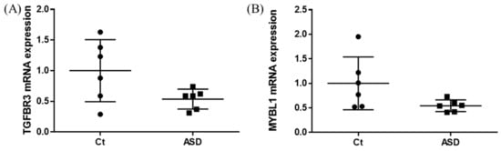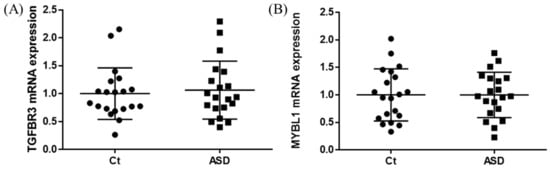 TGFBR3 and MYBL1 mRNA expression in the discovery cohort. The y-axis represents the ratio of the relative expression value of the control and ASD subjects for TGFBR3 (A) and MYBL (B). Ct, controls; ASD, autism spectrum disorder.