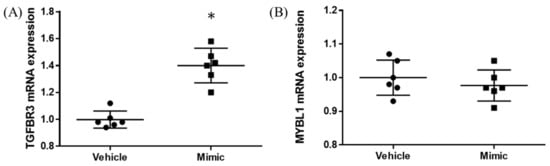 In the miR-15b-5p oligo-transfected HEK293 cells, about 1,000 times upregulation of miR-15b-5p expression was found (vehicle vs. mimic = 1.00 ± 0.08 vs. 1020.95 ± 461.28, p = 0.004; Figure S1). Significant upregulation was found for TGFBR3 expression (vehicle vs. mimic = 1.00 ± 0.07 vs. 1.40 ± 0.13, p < 0.001; Figure 4A). No significant changes were observed in MYBL1 (p = 0.412; Figure 4B).