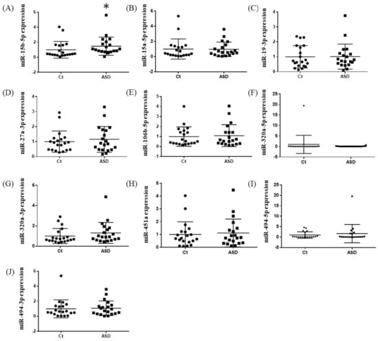 Expression of ten miRNAs in the replication cohort. The y-axis represents the ratio of relative expression values of the control and ASD subjects. The expression of the ten miRNAs were measured by qPCR: (A) miR-15b-5p, (B) miR-15a-5p, (C) miR-19b-3p, (D) miR-27a-3p, (E) miR-160b-5p, (F) miR-320a-5p, (G) miR-320a-3p, (H) miR-451a, (I) miR-494-5p, and (J) miR-494-3p. miR, microRNA; Ct, controls; ASD, autism spectrum disorder. * p < 0.05.