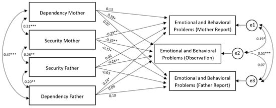 First, we were interested in the associations between child–mother and child–father attachment security and dependency and reported as well as observed child symptoms of emotional and behavioral problems. Table 1 also shows these correlation coefficients. Attachment security to mother was significantly negatively associated with maternal reports on emotional and behavioral problems of the child and observed symptoms. Furthermore, attachment security to mother was marginally negatively related to paternal report on symptomatology. Thus, children with lower attachment security to mother showed more emotional and behavioral problems in maternal and paternal reports, as well as in the observation. Dependency to mother was marginally positively associated with maternal report and observation of child symptomatology. Thus, mothers reported more symptoms and coders rated higher symptomatology for children with higher dependency scores towards mothers. Attachment security to father was significantly negatively related to observed symptomatology, indicating, that a more secure child–father attachment goes along with less observed symptoms. Furthermore, child–father dependency was significantly positively related to maternal reports of emotional and behavioral problems of the child. Thus, mothers described children with higher dependency scores towards the father as having more emotional and behavioral problems. No other associations were found.