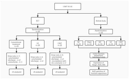 In the RCT, a total of 84 patients were eligible at enrollment. Each group recruited 28 patients, and 3 patients drop out in the control group, 4 in the CIMT group and 2 in the UE group. Nine patients dropped out (5 unscheduled discharged without finishing the treatment; 2 developed severe pneumonia; 2 voluntarily withdrew due to intolerance to constrain). Finally, 75 patients completed the intervention and were analyzed.