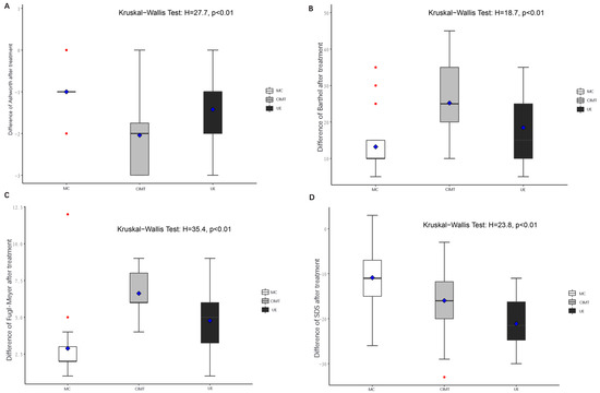 CIMT was more effective than UE in improving limb function in stroke patients. (A) change of Ashworth score before and after the treatment in each group; (B) change of Barthel index before and after the treatment in each group; (C) change of Fugl–Meyer score before and after the treatment in each group; (D) change of SDS before and after the treatment in each group. Significance was calculated with the Kruskal–Wallis test. MC: model control; CIMT: constraint-induced movement therapy; UE: unconstraint exercise.