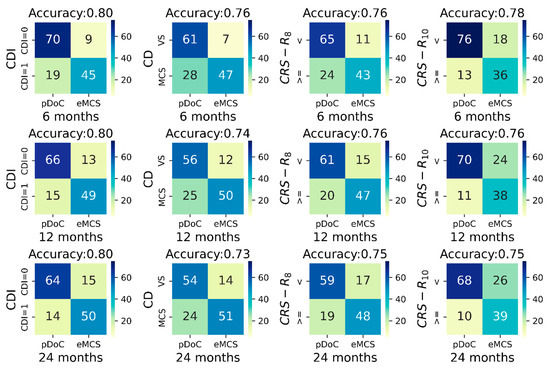 Importantly, the CDI univariate prediction accuracy was higher by 4%, 6%, and 7% for the 6-, 12-, and 24-month outcome, respectively, compared to accuracy of the clinical diagnosis. Similarly, the prediction accuracy of the CDI was also higher than that of the CRS-R8 and of the CRS-R10 (see Figure 1).