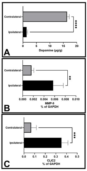 Microglial activation is a common feature of Parkinson’s disease, and we reported huge microglial accumulation in substantia nigra reticulata in our earlier work using 6-OHDA []. Considering the driving effects of CLIC2 on microglial invasion activity, we prepared 6-OHDA-treated unilateral Parkinson’s disease models where stratal dopamine content was decreased on the ipsilateral side (p < 0.0001, contralateral side, Figure 1A). Interestingly, we found the mRNA expression of CLIC2 was increased on the ipsilateral side (p < 0.001 vs. contralateral side, Figure 1C). Simultaneously, MMP-9 mRNA expression was also increased in similar fashion on the lesion side (p < 0.01 vs. contralateral side, Figure 1B).