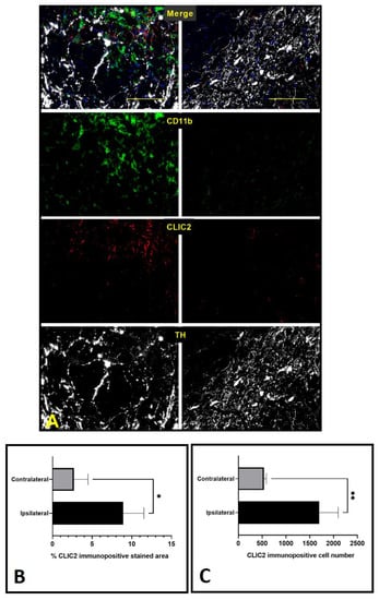 To identify the cell types expressing CLIC2 in the lesioned area of 6-OHDA-treated PD-model rat brain, triple immunofluorescence staining was performed using cryo-sections of the brain section at the substantia nigra pars compacta. Figure 2A displays localization of CLIC2 (red) with TH, which was visualized with white color, and CD11b was visualized in green color in the brain tissue of the 6-OHDA-treated unilateral Parkinson’s disease rat model. Morphometric analysis showed an increase CLIC2+ area in the lesioned side as compared to the un-lesioned side (p < 0.05, Figure 2B). In addition to this, in contrast with contralateral side, the number of CLIC2+ cells also remarkably increased on the ipsilateral side (p < 0.01, Figure 2C). Collectively, this immunofluorescence observation suggests the involvement of CLIC2 in microglial infiltration in the lesion area of PD brains.