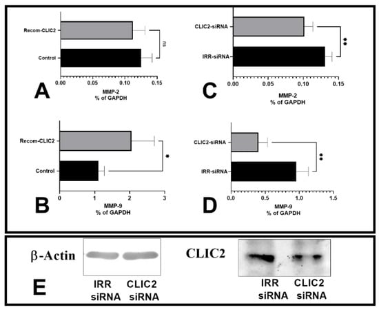 Our previous report demonstrated that siRNA-induced CLIC2 knockdown in meningioma cells causes increased MMP-2 expression []. To elucidate the connection between CLIC2 and microglia MMPs, we also performed the same experiment and found that the expression of MMP-2 and MMP-9 decreased following CLIC2 knockdown in primary microglial cell cultures (p < 0.01, vs. control siRNA, Figure 3C,D). Next, we took advantage of a wheat protein synthesis system in which highly aqueous, buffer-soluble, GST-tagged recombinant CLIC2 was synthesized []. Recombinant CLIC2 protein was added to primary cultured microglia and incubated overnight, where recombinant CLIC2 increased the mRNA expression of MMP-9 (p < 0.05, vs. control medium, Figure 3B) but did not affect MMP-2 expression (Figure 3A).