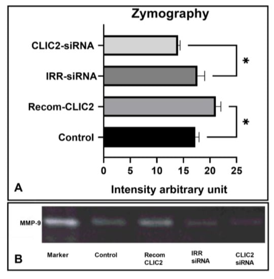 Considering the silencing of CLIC2 and modulatory effects of CLIC2 on microglial expression of MMP-2 and MMP-9, we performed a zymography assay, which is a simple technique that is commonly used to study the activity of MMPs. For this experiment, we used the supernatant from the samples in which recombinant CLIC2 was added to microglia and incubated overnight. As expected, exposure to recombinant CLIC2 increased the release of microglial MMP-9 (p < 0.05 compared to the control media, Figure 4). We also performed the same assay with CLIC2 knockdown and control samples, where CLIC2 knockdown decreased the release of MMP-9 (p < 0.05 compared to the irr-siRNA, Figure 4).
