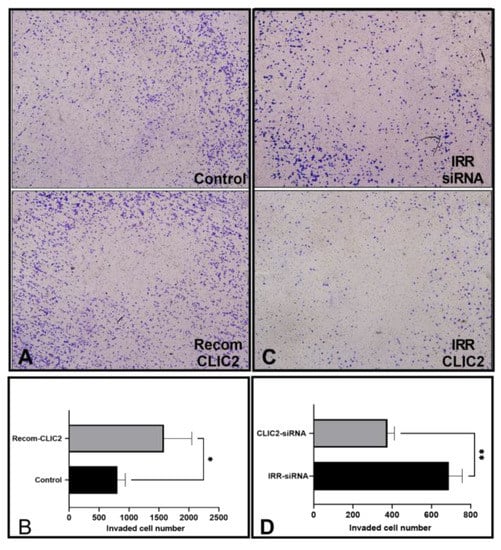 Modulatory effects of CLIC2 on microglial invasion activity. Recombinant CLIC2 accelerated the invasion of microglial cells. n = 4. CLIC2 silencing decreased the invasive activity of microglia (n = 3). Data are expressed as mean ± SD. Unpaired two-tailed t-test were applied. * p < 0.05 and ** p < 0.01 indicate significant differences between the two groups (B,D). Representative photographs for each group (A,C).