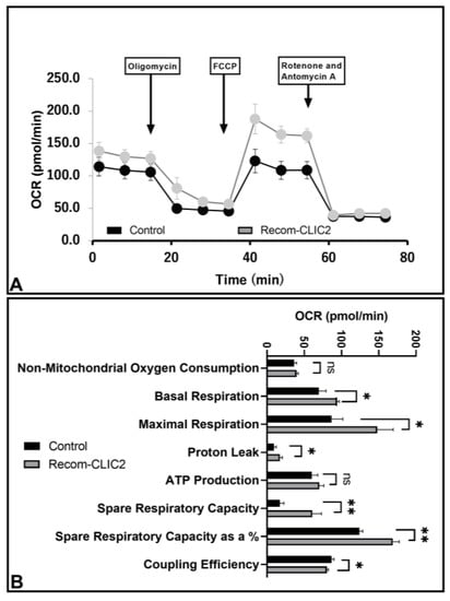 Modulatory effects of CLIC2 on the mitochondrial function in microglia. Recombinant CLIC2 exposure significantly enhanced mitochondrial function in primary cultured microglial cells. Mitochondrial oxygen consumption rate (OCR) (A) and mitochondrial extracellular acidification rate (ECAR) (B) were determined using a Seahorse XFp extracellular Flux Analyzer in microglia exposed to CLIC2 for 24 h. * p < 0.05 and ** p < 0.01 specify significant difference between the two groups.