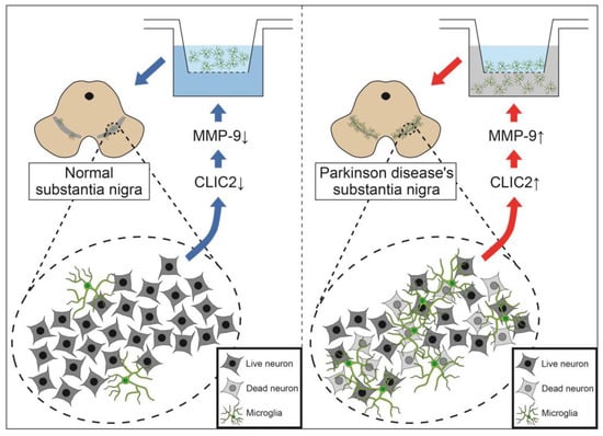 Diagram of the present hypothesis. Under normal condition (Left), CLIC2, MPP-9 expression, and microglial invasion in substantia nigra pars compacta are minimal. In PD condition (Right), increased CLIC2 expression results in increased MMP-9 activity and microglial invasion in the substantia nigra pars compacta.