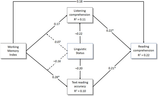 Model 1: A multiple regression analysis including the working memory index (predictor), listening comprehension and reading accuracy (mediators), linguistic status (moderator) and reading comprehension (outcome). Notes. * p < 0.05. Dashed lines indicate the moderating effect of linguistic status. Parents’ years of education were not represented to avoid cluttering the figure. Standardised betas for this covariate were 0.19 (p = 0.07) for listening comprehension, 0.12 (p = 0.21) for text reading accuracy and 0.10 (p = 0.31) for reading comprehension.