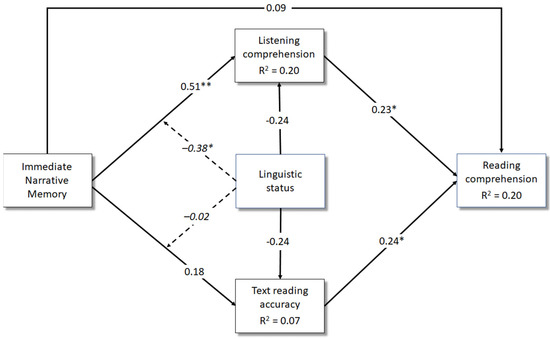 Model 2: A multiple regression analysis including immediate narrative memory (predictor), listening comprehension and reading accuracy (mediators), linguistic status (moderator) and reading comprehension (outcome). Notes. * p < 0.05; ** p < 0.01. Dashed lines indicate the moderating effect of linguistic status. Parents’ years of education were not represented to avoid cluttering the figure. Standardised betas for this covariate were 0.14 (p = 0.10) for listening comprehension, 0.13 (p = 0.22) for text reading accuracy and 0.11 (p = 0.28) for reading comprehension.